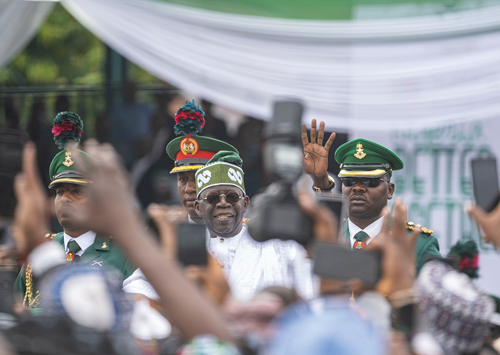 Nigerian president Bola Ahmed Tinubu waves at supporters during his swearing-in ceremony on May 29, 2023. Image credit Paul Kagame via Flickr CC.