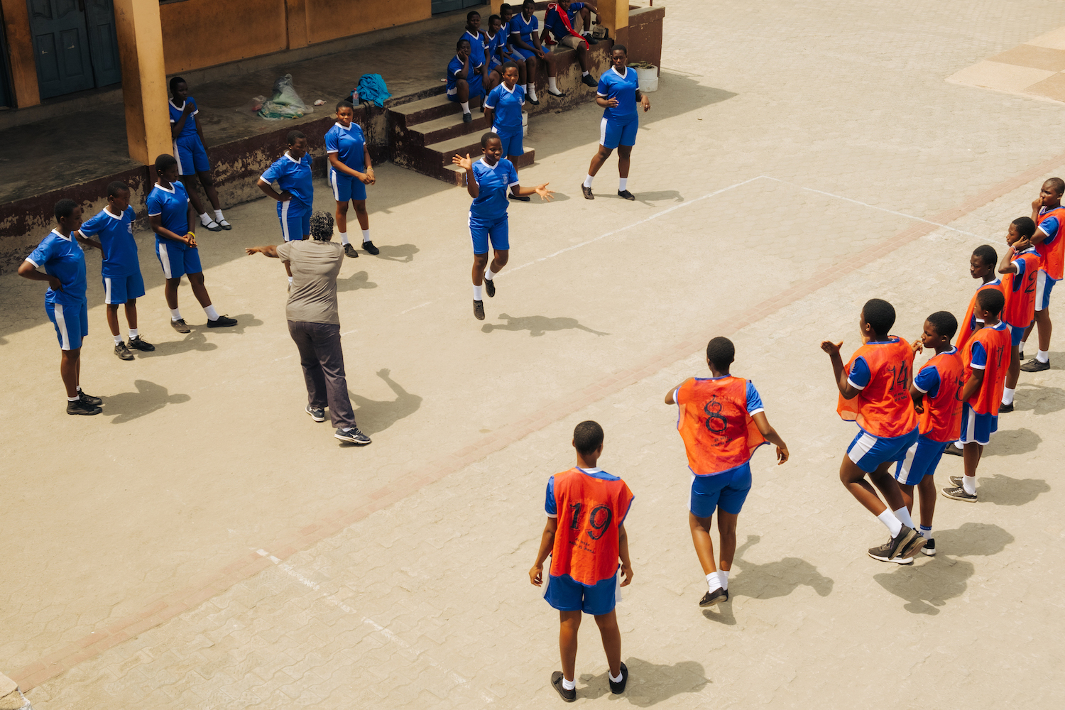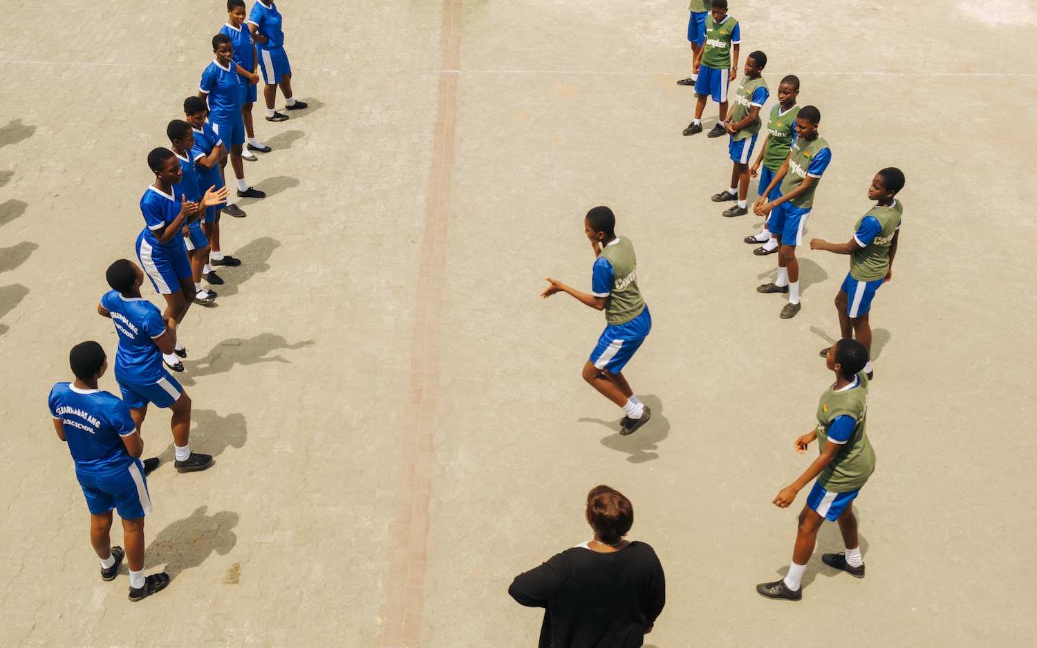 The film took me back to the sandy playground of my childhood. The game, Ampe, requires a bank of two teams facing off against each other, player to player. Each player, and their opponent jump at the same time, clap, and put a foot forward before landing. One team chooses to win the individual duels when the feet of opposing players align: the left foot on one side meeting the right on the other or the right meeting the left. The opposing team wins when the feet don’t align across the divide. The winner keeps going down the line until all players on one side are knocked out. The winning team earns a “bomb” to eject one player from the opposing team, before the next round.