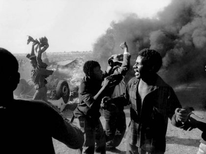 As a car burns behind him, a young South African participates in a civil disturbance outside the Auduza Cemetery. Image credit P Magubane for the UN via Flickr CC BY-NC-ND 2.0.