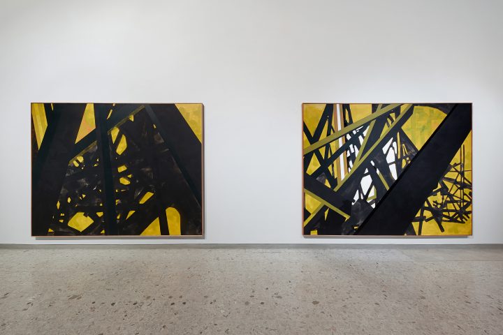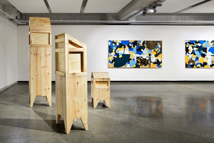 For years, Nitegeka only used black in his work, as this related with central themes in his work such as the uncertainty of the future and the void, but also to his identity as a black man. His choice of materials was intentional from the get go, as he mostly worked with found materials and crates because “they’ve lived in the world, they’ve done things.” Although most of Nitegeka’s works aren’t figurative, the figures that do appear are always the same ones covered in all-black suits. The suits strip away physical features, past experiences and individual identities, rendering the figures anonymous and equal within their shared circumstances. The ‘subjects’ Nitegeka depicts struggling through uneasy paths, pushing against walls, and lifting mended objects could be anyone. As characters of an unfinished story, these figures could be spotted at WAM in the film Black Subjects (2012) and in large scale paintings like Displaced Peoples in Situ: Studio Study XXXVIII (2025). He explained that “the reason for that conceptually, is to put the same people in different environments… that they are moving. There’s this movement: today there are in this painting, then they’re going to end up in a different painting, and they’re going to be in a different environment and landscape. They’re going to be figuring out and in this mess where they, you know, pushing things, they’re trying to organize, and this perpetual, never ending exercise that they’re involved in. They’re in this liminal space indefinitely…”