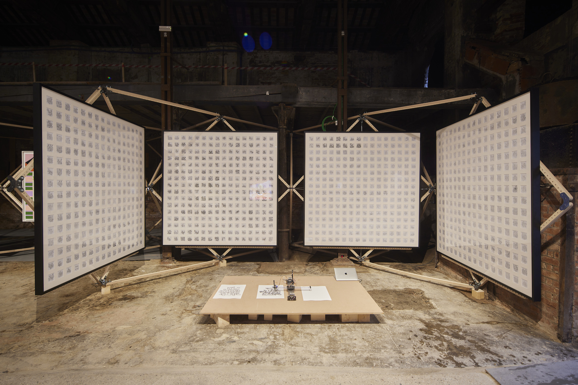 The artists included in these African pavilions negotiate wildly different levels of access to materials and representation as they explore notions of personhood pressed to the edges of existence. Engagements with technology sit awkwardly next to a preponderance of painting and the handwrought, as in South Africa’s pavilion, where Phumulani Ntuli pairs augmented reality via tablet computers with his acrylic canvas, “Swaying Through the Portholes” (2021). Ghana’s pavilion (its second after 2019) presents a range of statements on “Africa” by curator Nana Oforiatta-Ayim, whose appointment and choices were subject to some grumbling by veteran Ghanaian artist Rikki Wemega-Kwaku. The pavilion includes artist Afroscope’s automatic drawings made with a computer program that is installed along with the work, as well as Na Chainkua Reindorf’s paintings that feature women in masquerade. All of the work is mounted on a latticework bamboo structure by D.K. Osseo-Asare; the result is a sustainable and tactical design. The exhibition celebrates unknown and young artists.