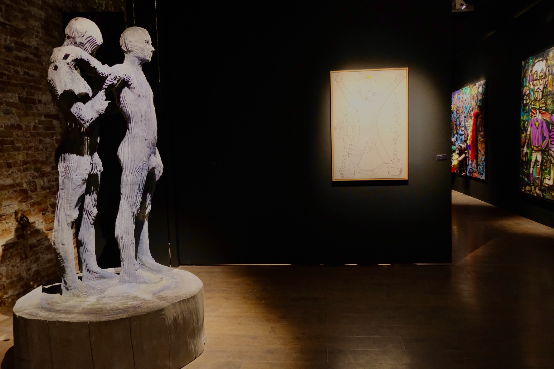 In the Côte d’Ivoire pavilion, an installation with dramatic lighting and an architectural focal point is used to feature an Italian artist, Aron Demetz, somewhat obscuring the intricate work of Saint-Etienne Yeanzy. Still, a good pairing in the pavilion is Demetz’s homoerotic nude male sculptural pair alongside veteran Ivoirian artist Frédéric Bruly Bouabre’s large drawing of a figure with an impossibly long phallus.