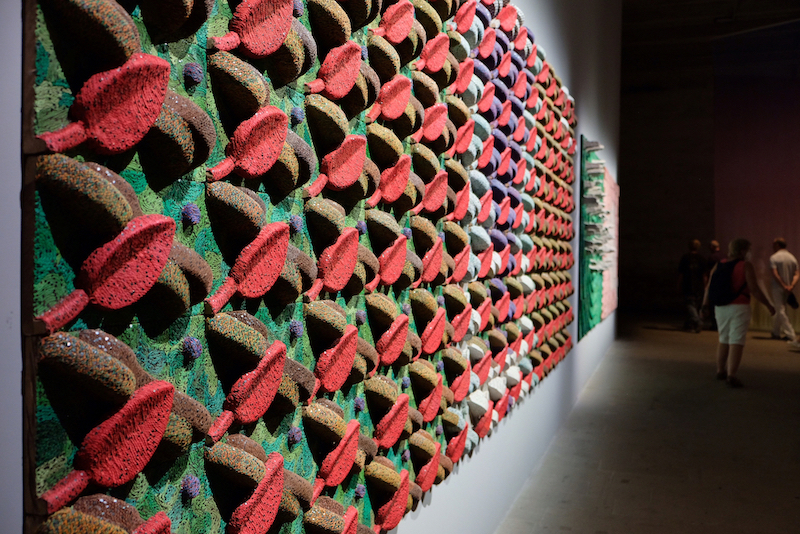 For the main exhibition, Alemani chose twelve African artists out of 213: Igshaan Adams, currently in a solo show at the Art Institute of Chicago; veteran painter Ibrahim El-Salahi; Kudzanai-Violet Hwami; Bronwyn Katz; Antoinette Lubaki; historical Egyptian painter Amy Nimr; ceramicist Magdalene Odundo; Elias Sime’s massive wall panels with reused computer circuits; and Zimbabwean Portia Zvavahera’s meditations on Pentecostal spiritualism. Pavilions from the continent represented Uganda, Cameroon, Egypt, Côte d’Ivoire, South Africa, Ghana, Namibia, and Kenya.