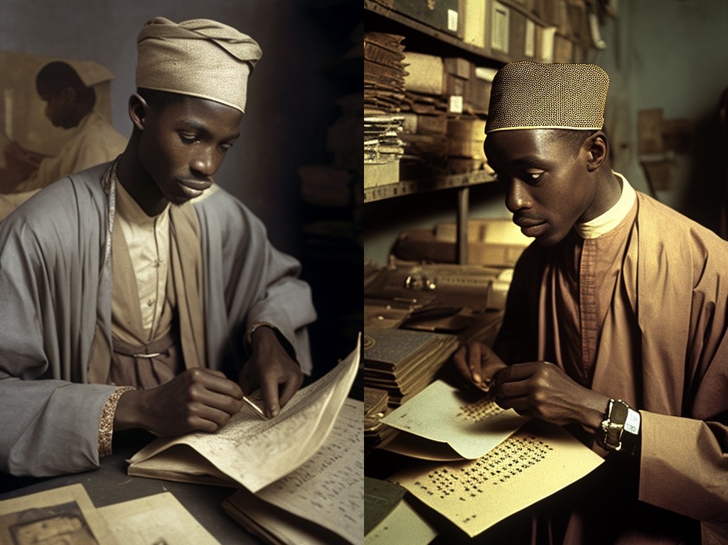 A computer generated image of a young Hausa man exploring archival records. Generated by Artificial Intelligence via Midjourney.