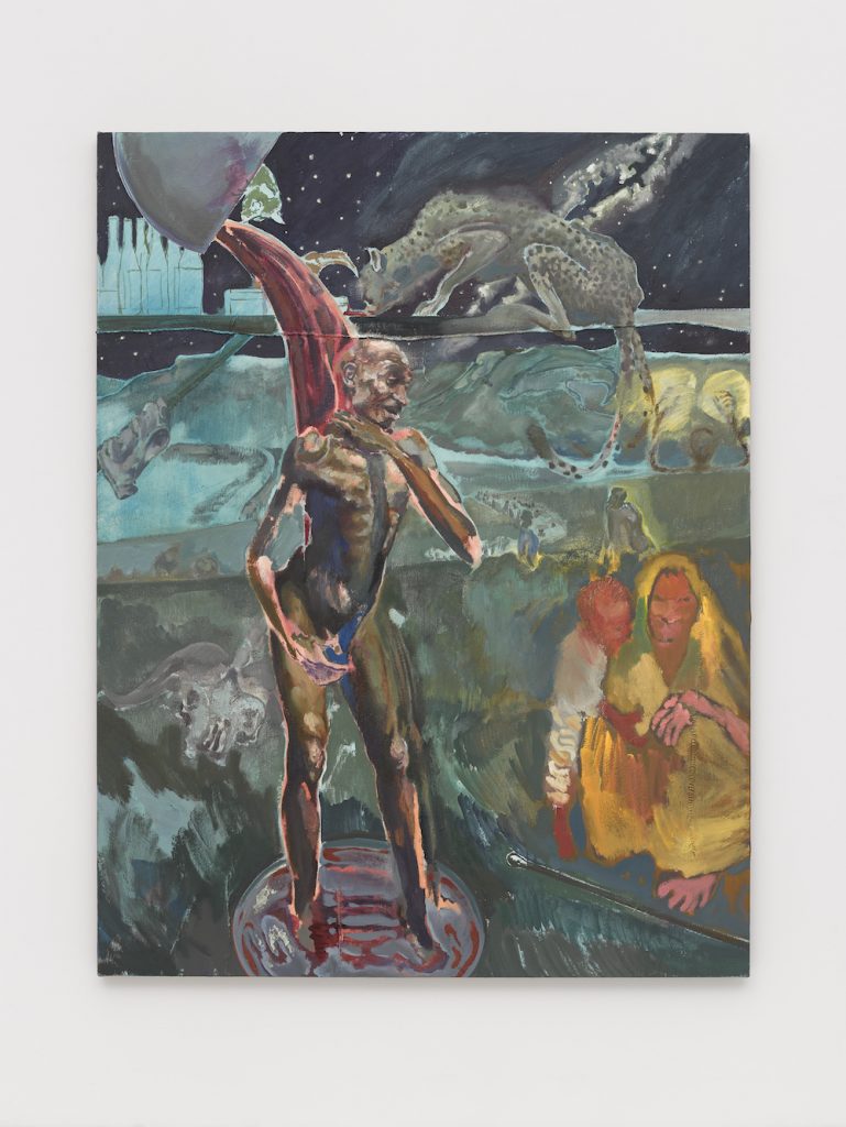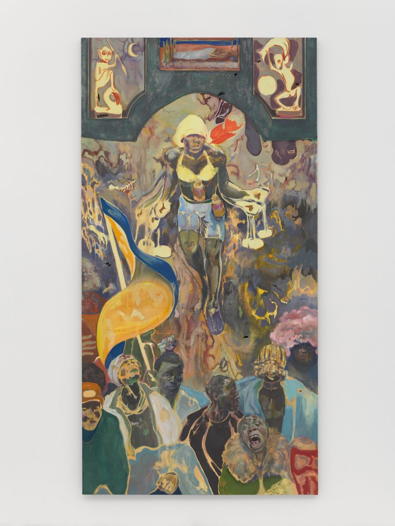 The body of work began in August 2017, when I went to the main opposition rally [in Kenya] just before our elections. I went there thinking about making a group of paintings that would deal with the power dynamics between a leader and followers. But, then, the kind of expression of this was pretty extraordinary. There were so many other dynamics that were happening, bringing into question the whole idea of support and what it was to lead. The rhetoric of the leader, in this particular instance, was really dark and had a very subversive tone […] Sometimes the rallies had turned violent, and sometimes there were protests. The visually most striking people would be the same guys who would throw the stones at the policemen when they would be tear gassed […] It was quite surreal to see someone dress up in a superhero outfit and clown hair running through tear gas with massive stones and a sling shot, and then to see them in the same kind of outfit at the base of the stage getting sort of orders.