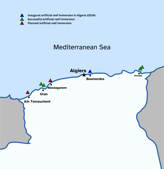 Over the last decade, there has been a surge in activity surrounding this issue, observes Professor Grimes. Several artificial reefs have been submerged off the Algerian coast by associations and researchers, notably in Oran and Mostaganem, which are located 420 and 330 kilometers west of Algiers, respectively. Other projects are in preliminary stages, including one in Aïn Témouchent, 490 kilometers west of Algiers, which is being worked on by Professor Grimes, himself.