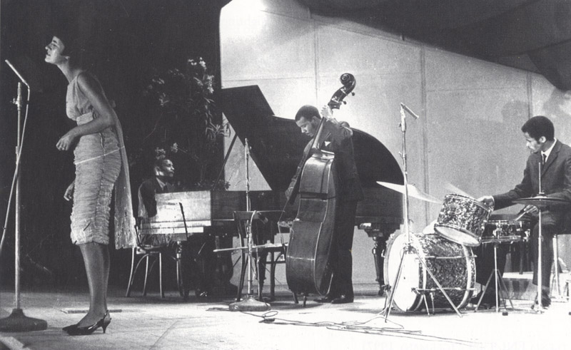 Sathima Bea Benjamin on stage with the Dollar Brand Trio.
