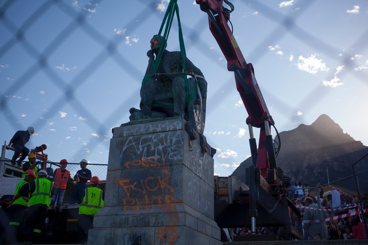 Once it had been pieced together, some brave, wiry students ascended the granite plinth, and working in careful synergy, balancing precariously, they drew the fluttering, black plastic sheet over the weather-beaten Rhodes. You heard the creaky-squeak of reams of cellotape that were unfurled in long, dark ribbons that were slung around and around the effigy, as they sealed it in the thin, dark plastic shroud. Wrapped in cheap material reserved for waste, the once magisterial Rhodes was left looking like a sad bergie, a homeless drunk, shabbily covered, shamefully alone.