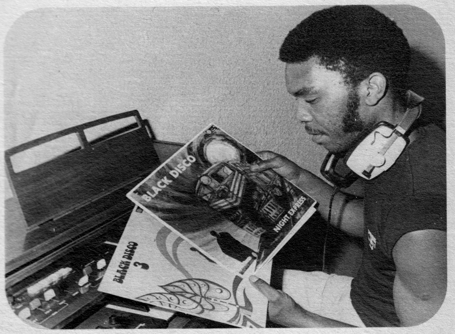 Pops Mohamed looking at the Black Disco records. Image taken from the back cover of the "Black Disco - Night Express" reissue by Matsuli Music. Image © Matsuli Music.