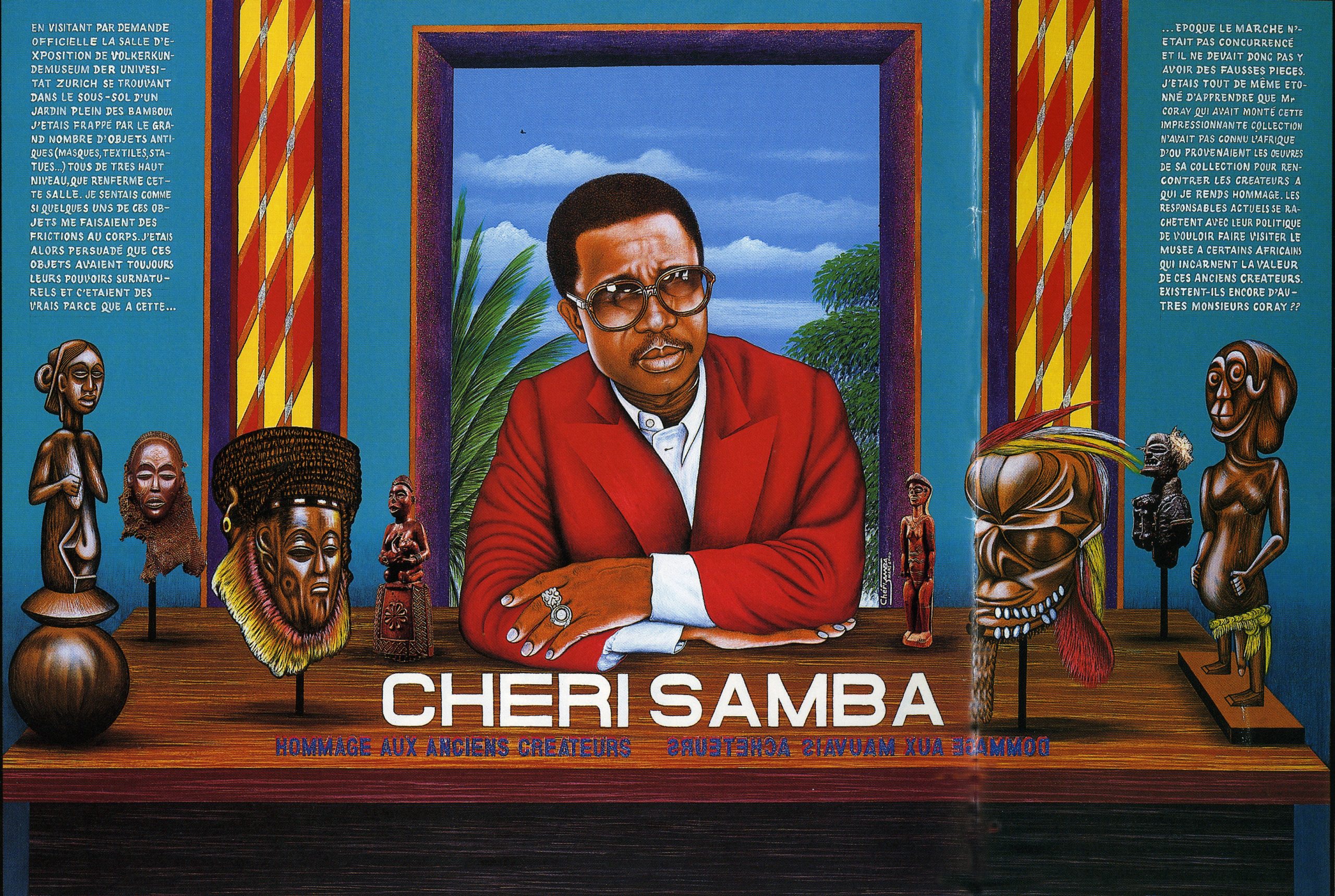 Chéri Samba is the undisputed king of popular painting from the Democratic Republic of Congo. Over the last 45 years or so he has been depicting the everyday concerns of his countrymen and women, reflecting on everything from education, morality, sexuality, and corruption in his paintings, using himself as a subject to comment on the social and political realities in his country. These scenes are depicted in his trademark style of humor, in vivid color, and often accompanied with text in his native Lingala or French.