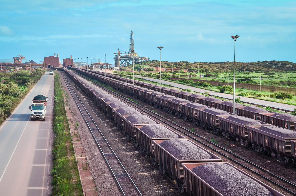 Iron ore loaded trains at the Saldanha terminal, South Africa. Image credit JB via Flickr.