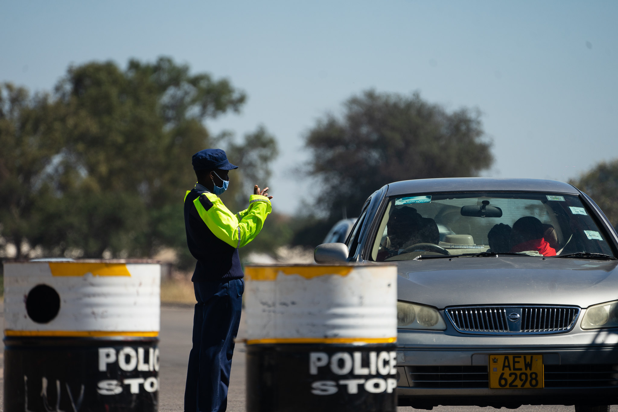 A police officer talks with a motorist at a checkpoint. Bulawayo, April 2020. Image credit KB Mpofu for the ILO via Flickr CC BY-NC-ND 2.0.