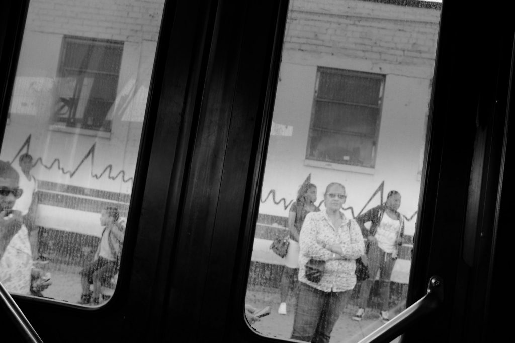This was taken from inside a bus. It is a great example of what really goes into making an image with regards to composition. I also picked this because I can connect it to the next image which gives a sense of being in Lagos in a car. But here we are in New York city in a bus and the image tells so much about life in the Bronx. I had just gotten onto the bus and here a few people were waiting to get on as well. I had no idea this is what I would make, until later when I got back onto my seat and looked back into the camera and saw it with the tilt and it was perfect. But I knew it was the time to use the camera. I felt like this was a great moment because I am on a bus and can see outside, and usually I like to photograph that particular wall with the life-line. Because it is by a bus stop, there are tons of people that usually stand around. The pose of the lady with the glasses for instance, I mean both of them and their gestures says so much. There is a gesture of wanting to survive I feel like, or insistence that we are here.