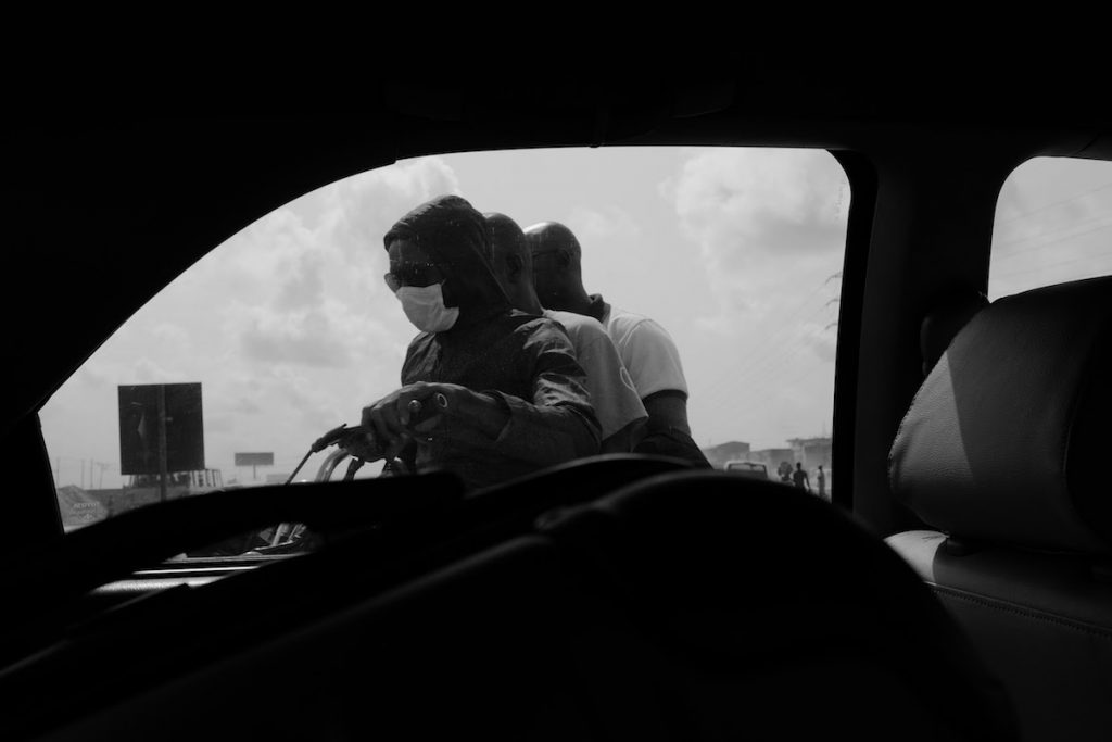 The previous photo was taken on a bus in the Bronx, and in this one I am back in Nigeria almost doing the same thing. You could see my traveling bag as well in the frame which says “hey I just arrived.” We are in a taxi in Lagos, just after having arrived. There were a bunch of okada guys driving through and it had this magic look, like a movie, with everyone frozen in time. Here the car and the rider are close, but it was great to see the wider scene of motorcycles on the street. There are tons of images I made, just from the back seat and you can see life happening, outside from the taxi window. But with this specifically the composition again is important. It contains the anxiety I felt about everyday life and being back home. Before this, at the airport it was quite interesting seeing folks want to help with your bag. I did document all those things. They are carrying your bag and you think to yourself “oh who are these faces”? They asked why I was taking photos of them and I said I was documenting life. They said “yes, yes take this back to America.” Even without knowingly doing so, this photo and the previous one are speaking to each other. In the Bronx and Lagos.