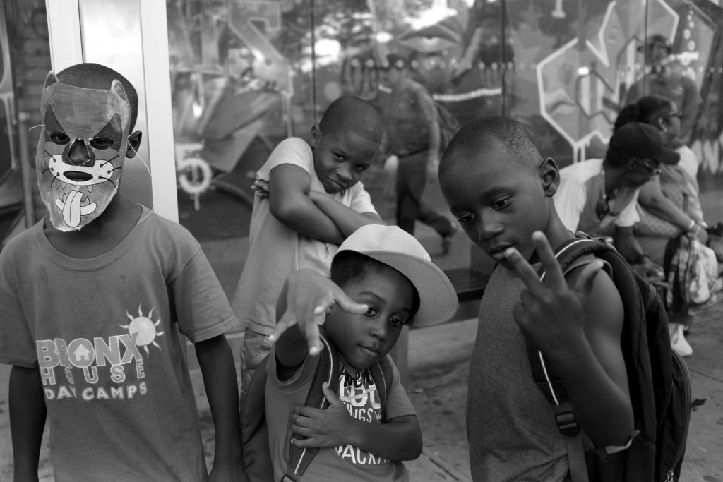 They call themselves the Johnsons. I was at the bus stop when I saw this group of kids with a guardian. The kid with the mask and the Bronx shirt caught my attention and they were all just full of energy. So I asked the guardian for permission if I could photograph them and she said yeah sure why not. When I faced the kids, they were so intelligent and full of life, they said, “Sir, Sir, is that a camera?” and I said yes it is a camera. “Are you going to take our pictures?” and I said yeah I am going to take your pictures. “Sir, Sir, can you make us famous?” and I said “I don’t know if I can do that but I will try.” They said, “yeah we are the Johnsons, we want to be famous so that way we can show our friends how famous we are.” And they just kept talking about fame. They are Bam Bam (mask), Sincere (arms folded), Najahpier (hat) and Jahray. Since I was like them once, black boys and African boys growing up in the Bronx, I’m drawn to making images of them knowing that they have their own unique stories and there is so much to learn from them. To keep hearing them talk about how they want to be famous and exuding so much life with all this great wisdom and personality was great. I mean look at them. They are a pack of personalities. A few days after this was made I saw them on the bus, and they kept screaming to their mom “Mom, mom, mom that’s the guy, that’s the photographer.” They came up to me and said “Hey mister, hey mister did you make us famous?” I had to speak to their mom and explain that I am a photographer. Because it was very awkward. When I had met them previously they were with a different guardian. So I ended up showing the photograph to mom and she smiled. I saw them a few times during that summer but haven’t seen the Johnsons since.