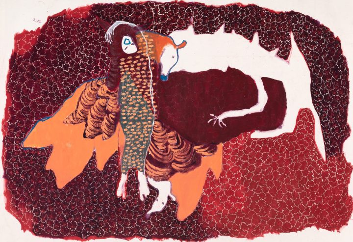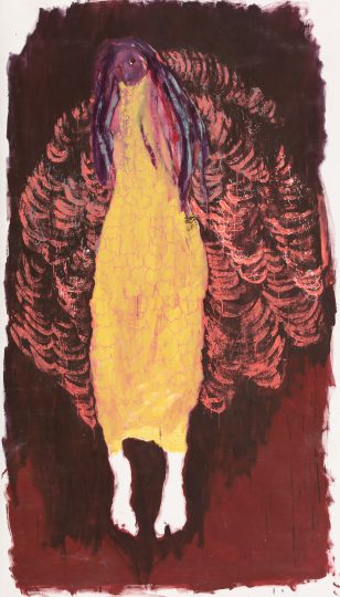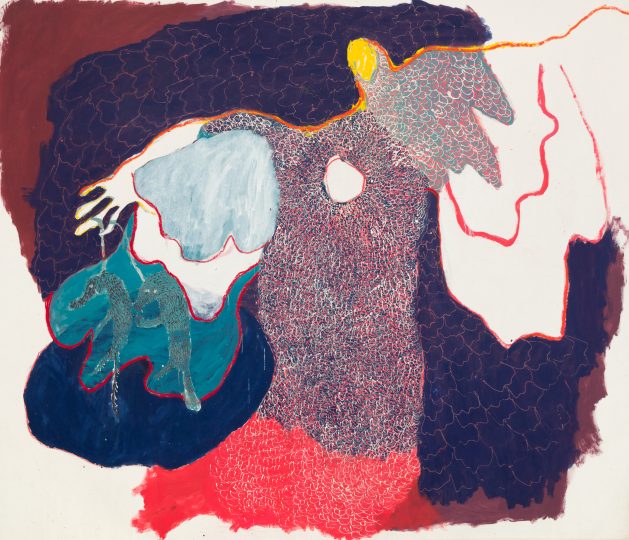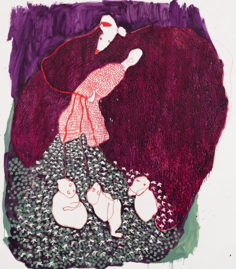 Woman and child figures dominate the large picture plane—a reflection perhaps of the early phases of motherhood. Each composition though is unique in its formal qualities with exaggerated limbs, daubed in reds, purples, greens, and ochres and more recently brighter oranges and yellows. Rich, textured areas contrast with surfaces that are completely untouched by the paintbrush, exposing the white acrylic primer—a testament to the artist’s growing confidence in recent years. These unelaborated areas allow the paintings to breathe and focus our attention on the large dreamy and ghostly figures and shapes, described by flat painted expressions of color and delicately drawn lines.