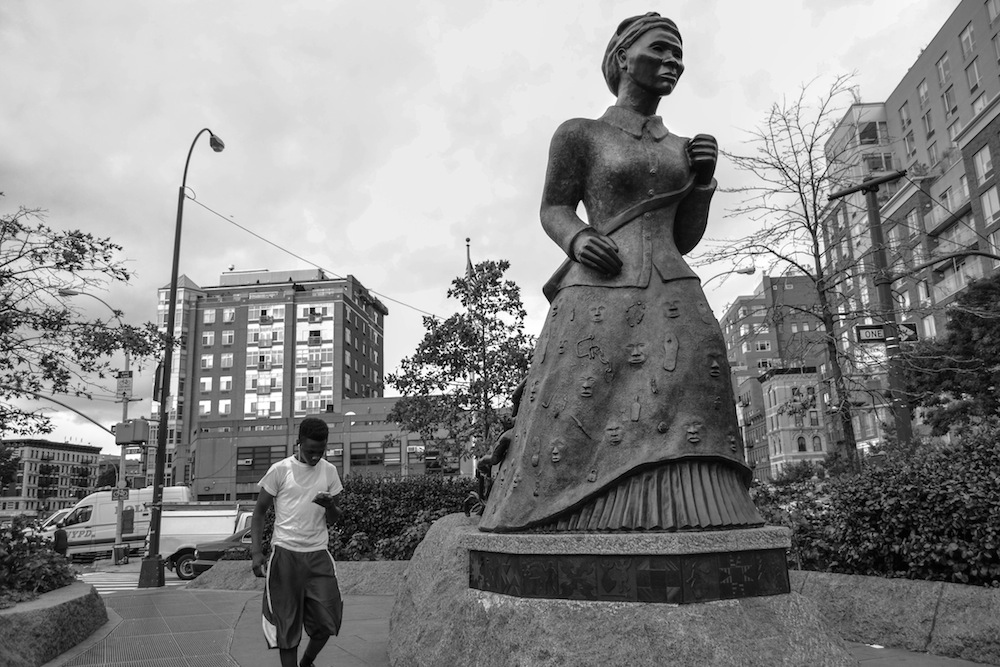 The drummers drum and play, while Adam looks far off into the horizon, one step forward, coat tails unfurled. An almost leap into the optimism he can see in the Horizon for the future of African Americans and all humans as a result. It is as if the drummers find this spot at the base of this statue as the only plausible space to play a daily requiem to: Harlem, Black internationalism, Pan -Africanism, American citizenship. These are all lost in the storm of what is, that side of the Millennium.
